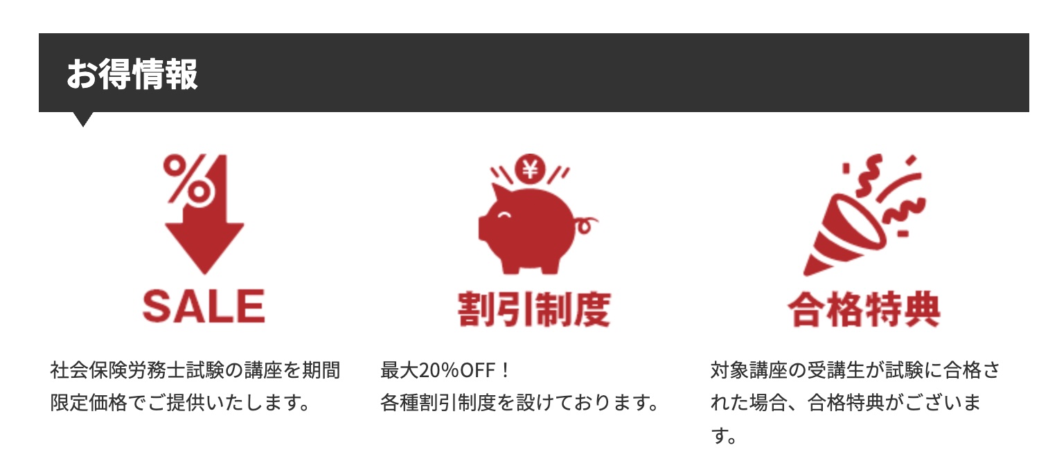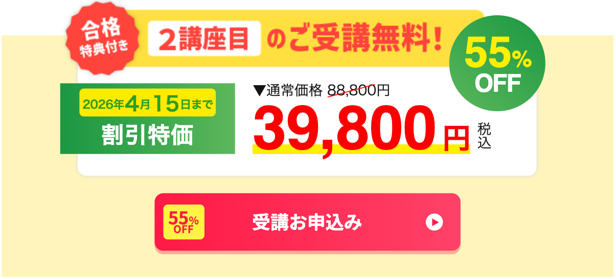 期間限定キャンペーンや対象者向けの割引制度もあり、タイミングによっては通常よりお得に受講できる場合があります。合格率やサポート体制に加えて制度面まで比較すると、非常にコストパフォーマンスに優れた通信講座です。