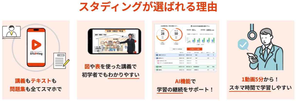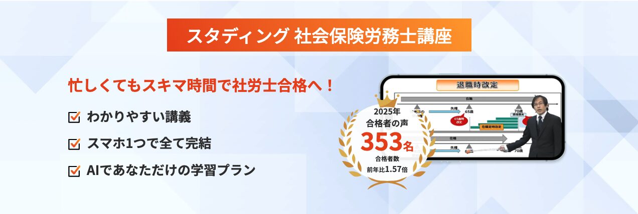 →アガルート社労士講座の詳細を見る - スタディング社労士講座はスマホで合格まで完結!受講者の合格率も高い