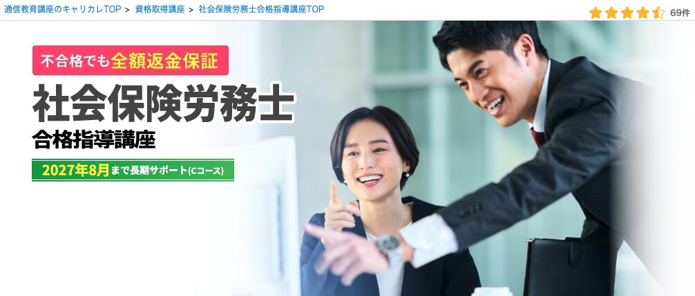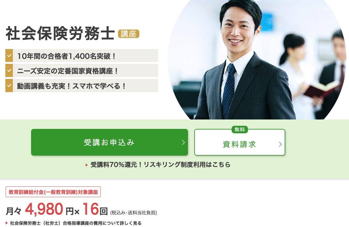 - 全額返金の合格特典も!絶対に社労士になると決めているなら実質無料