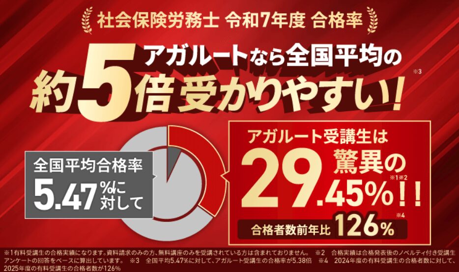 アガルート社労士講座の強みは、人気だけでなく数字でも評価しやすい点です。令和7年度の社労士試験の有料受講生合格率は29.45%で、全国平均合格率5.47%の5.38倍と優れた受講生合格率を誇ります。