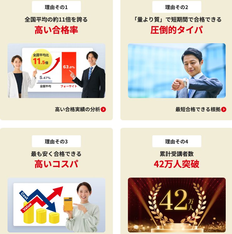 | 特徴 | 合格したら全額返金 受講者合格率も高い 迷ったらここでOK | スマホ一つで合格 動画講義が抜群に良い 最安レベル | セーフティーコースが安心 WEB学習の対応度も高い | 脅威の合格率60%超 受講費用安め 学習計画も立てやすい | 隙間時間の活用がしやすい 11回も添削が使える | 通学も選べる コースの割引も豊富 | 要点の絞り込みが秀逸 不合格でも全額返金 | 難関資格合格の実績 3つの学習システムから選べる | 安価に大量の動画講義 圧倒的に安い | 基礎がしっかり学べる 無制限に質問できる |