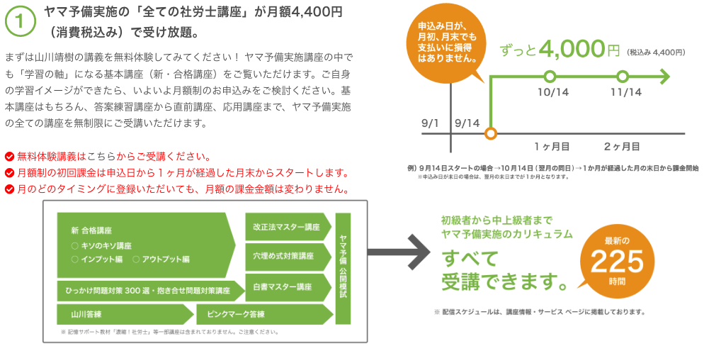 | コース・料金 | 【2027年合格目標 基礎講義&入門総合講義】 ・基礎講義&入門総合講義:97,020円(税込) ・入門カリキュラム・フル:235,620円(税込) ・入門カリキュラム・ライト:166,320円(税込) 【2027年合格目標 キックオフ社労士】 ・キックオフ社労士:43,780円(税込) 【2026年合格目標 基礎講義&入門総合講義】 ・入門カリキュラム・フル:205,920円 ・入門カリキュラム・ライト:136,620円 ・基礎講義&総合講義:87,780円 ・定期カウンセリング:110,000円 【2026年合格目標 キックオフ社労士】 ・キックオフ社労士:43,780円 【2026年合格目標 速習カリキュラム】 ・速習カリキュラム:195,800円 【2026年合格目標 中上級総合/中上級カリキュラム】 ・中上級カリキュラム/フル:245,220円 ・中上級カリキュラム/ライト:176,220円 ・中上級総合講義:162,800円 ・定期カウンセリング:110,000円 【2026年合格目標 総まとめ講座/上級カリキュラム】 ・上級カリキュラム/フル:215,820円 ・上級カリキュラム/ライト:146,520円 ・総まとめ講座:107,800円 ・定期カウンセリング:110,000円 |