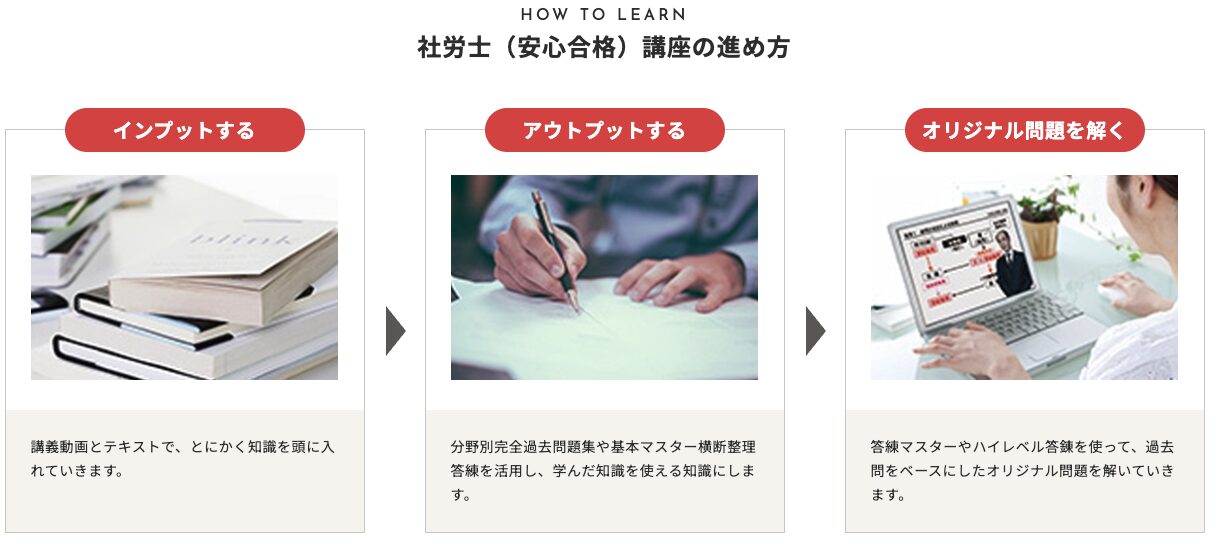 社労士通信講座のテキストや講義でインプットした内容は、同じ講座の問題演習を通じてアウトプットすることが重要です。アウトプットによって、定着度も増しますし、より実践的な知識・経験値として身につきます。