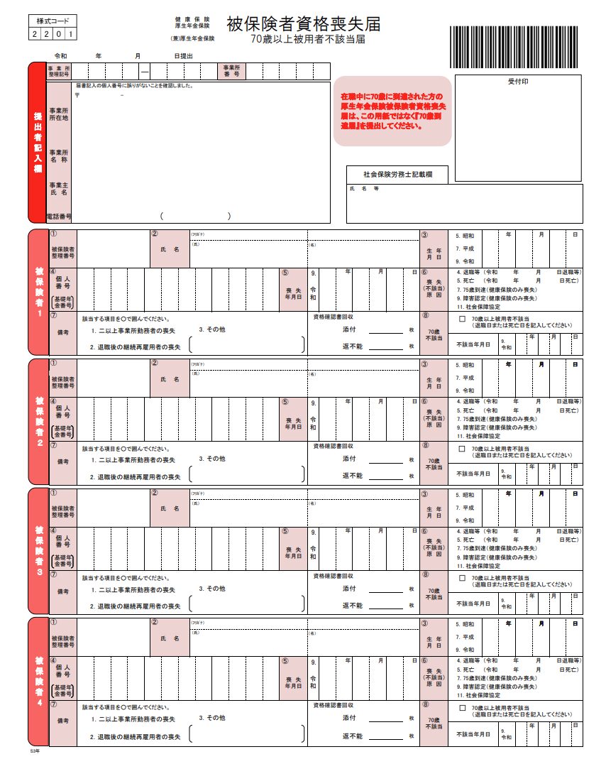 - 「健康保険・厚生年金保険 被保険者資格喪失届(70歳以上被用者不該当届)」(70歳以上被用者でなくなったことを届け出ます )