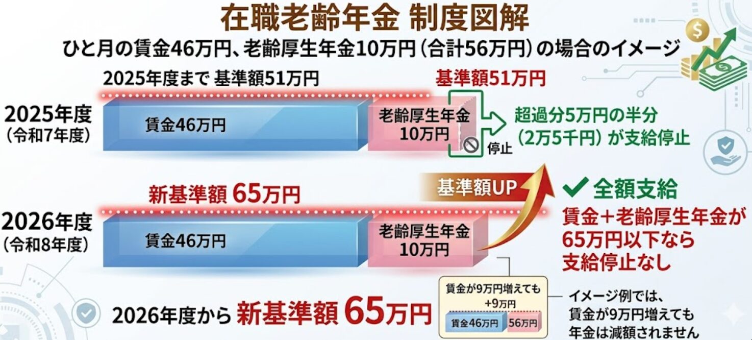 令和8年度(2026年度)からは、支給停止調整額が従来の51万円から65万円へ大幅に引き上げられました。 具体的には、基本月額と総報酬月額相当額の合計が65万円を超える場合、その超えた額の2分の1が年金支給額からカットされます。