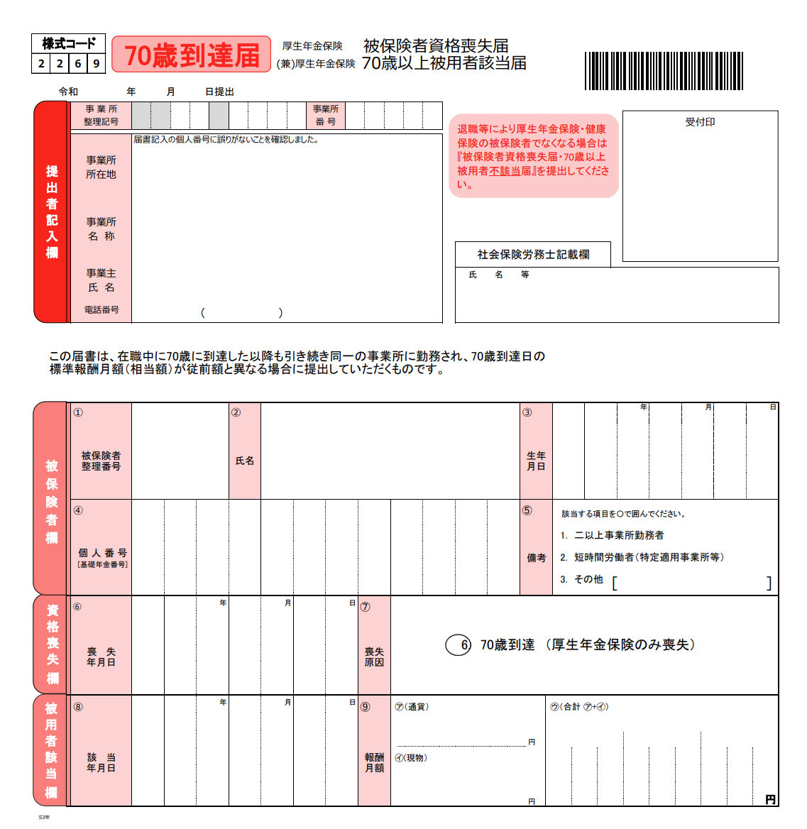 「厚生年金保険 70歳以上被用者該当届」(70歳到達時に、再雇用などで標準報酬月額が従前と変わる場合や、新たに70歳以上被用者として適用される場合など )